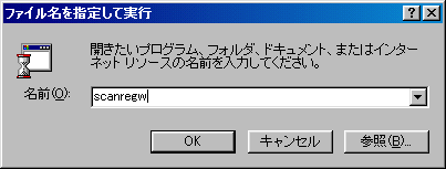 手動でレジストリチェッカーを起動する場合は「スタートメニュー」->「ファイル名を指定して実行(R)...」から「scanregw」として実行します。