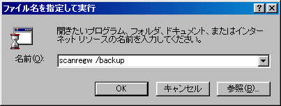バックアップの時と同じように、「ファイル名を指定して実行」ダイアログで、「scanregw /restore」を実行します。
