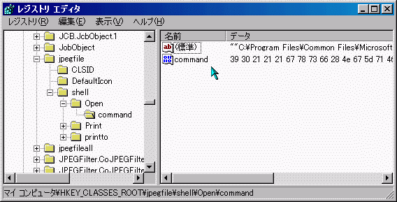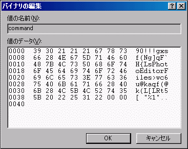 .jpgに関連付けられたファイルタイプが「jpegfile」で、そのデータを見てみると、通常の関連つけのデータと同じように、shellキーやopenキーやcommandキーがあります。ところがcommandキーの値に「(標準)」の他に、「command」というバイナリ値が見えます。このバイナリ値には、訳のわからないデータが書かれています。このデータを見てみると、以下のようになってます。