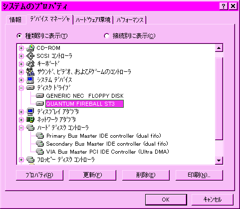 実はPentium-II自作機の時も似たようなことがあった。このハードディスク(Quantum Fireball ST 3.2A)は昨年のPentium-II自作時にはこのマシンに接続していたのだが、この時ASUSのP2L97添付のCD-ROMから440LX用のドライバをインストールしたら、デバイスマネージャの記述は上記とほぼ同じ(勿論VIAの部分はIntel云々だけど)ものになり、テスト値はガクンと下がってしまった。ただこの時はハードディスクのプロパティの方は見なかったのでチェック項目がどうなっていたかは分からない。ただ「GENERIC...」だったような気がする。もしそうでないなら気づいていたはずだから。