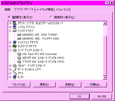 やはりAOchip.exeのあったページに「VIA Bus Master (Ultra DMA) PCI IDE Driver for Windows95/NT」というのがあったのでダウンロードしてくる。如何にもそれといった名称である。早速インストールしてみる。ふんふん確かにデバイスマネージャの記述は変わり、まさしくUltra-DMAになったという感じだ。