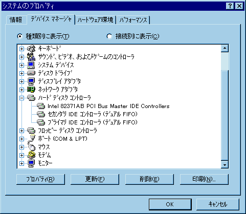 結局「Intel 82371AB PCI Bus Master IDE Controllers」というの残ってしまい、その下の子デバイスが日本語になった。ところがこのようなかったら、ベンチマークテスト結果が格段に良くなったのである。詳細にテストしても確実にドライブの性能を引き出し、Ultra-ATAで転送されていることを裏付ける結果なっていた。理由は良く分からなかったが結果オーライでよしとしていた。現在もそのままである。