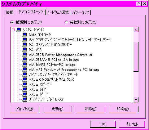 まあDMA mode2にはなっているようだし、現実にはこれで殆ど問題ないはずなので、VIAに期待しつつ、今回のところは「IDEコントローラ」に関してはこれにて一件落着と行きたい。ところで最初のVIAのコントローラを削除した後のものと、パッチを当てたものは、性能は全く変わらないのでどちらでもいいと思う。一応曲がりなりにも「Bus Master」という記述のある後者の方が気分的にいいので、私はパッチを当てた方でいくことにした。しかしこのパッチを当てると「システムデバイス」の記述も以下のように変わった。