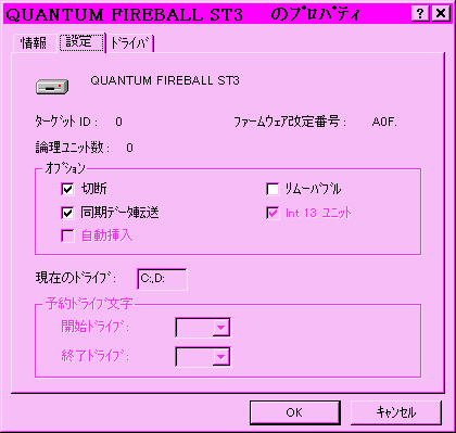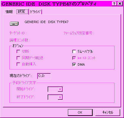 どうも普通のIDEハードディスクのプロパティと違う。バスマスターのはずなのに「DMA」のチェックボタンもないし、SCSIハードディスクのように「切断」や「同期データ転送」にもチェックがついている。