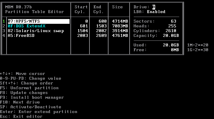 パーティションの作成、消去、サイズの変更、パーティションタイプの変更、アクティブ属性の変更などが可能である。基本的にはFDISKの機能を拡張したようなつくりなので、Partition Magicなどのようにデータを保持したままの変更などは当然できないが、WindowsのFDISKでは不可能な複数の基本領域の作成、FAT系以外の取り扱いが可能なので重宝する。バージョン0.37から論理領域もサポートされるようになったので大変便利だ。
