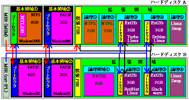 またMBMは第2ハードディスク以降からWindowsMEの起動に問題があるため、MBM起動時にはWindowsMEが第1ハードディスクになければならない。だから、ハードディスクBが第1ハードディスクの場合、第2ハードディスク以降のWindowsMEを問題なく起動できるext-IPLをMBRに配置している。ext-IPLは拡張領域起動ができない一方で論理領域起動が可能なので、MBMとは違い、直接それぞれの論理領域のブートセクターをチェーンロードして、そこからカーネルのロードはLILOに引き継ぐ形になる。上図で黄色の部分にはLILOがあることを示している。