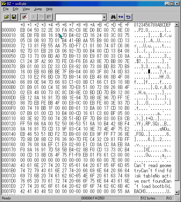 正しくブートレコードをファイル化できたらこれをバイナリエディタでデータの一部を書き換える。BZで中身を見てみよう。