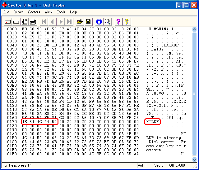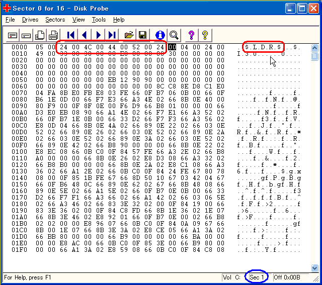 オフセット2から「4E 00 54 00 4C 00 44 00 52」とあるのがIPLで読み込むファイル「NTLDR」を指定するところである。1文字1文字の間に「00」が入っているので気をつけてほしい。ここを「$LDR$」に変更する。「24 00 4C 00 44 00 52 00 24」と直接入力する。