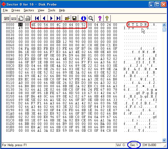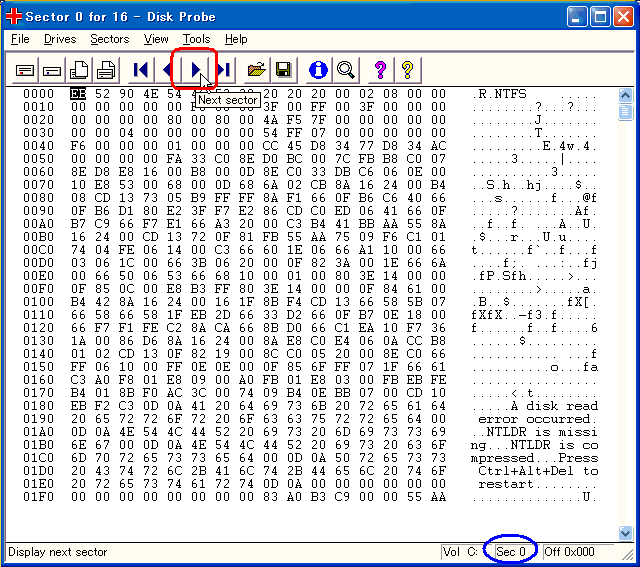 NTFSの場合、書き換え対象データは第2セクターにあるので、「Next sector」ボタンで次のセクターへ移動する。