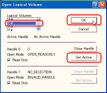 「Logical Volumes」リストの「C:\」をダブルクリックすると下の「Handle:0」が「C」となるので、ここの「Set Active」ボタンをクリックする。「Active Handle」が「C」になるはずである。今回はハードディスクのデータは読むだけなので、必ず「Read Only」をチェックしておこう。誤って大切なハードディスクのデータを書き換えてしまうことがなくなる。設定したら「OK」ボタンをクリックする。