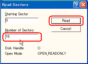 ターゲットパーティションを設定したら、早速セクターを読みこんでみる。「Sectors」メニューの「Read」メニューを選択すると「Read Sectors」ダイアログが表示される。