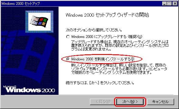 これは無視して先に進んでほしい。次のインストールオプション選択では、「Windows 2000 を新規インストールする(I)」を選択してほしい。もっとも上記ダイアログが出る場合は、一方の「Windows 2000 にアップグレードする(推奨)(U)」は選択できなくなっている。