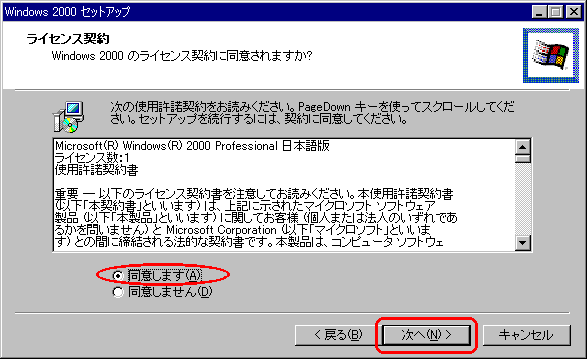 次のライセンス契約画面では「同意します(A)」を選択して進む。