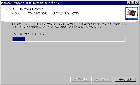 ここでインストールファイルのコピーが始まる。ネットワークからのインストールした場合はかなり時間がかかるかもしれないが、ここでは必ずこの様子を見守ってほしい。決してトイレなどにたたないように。理由は後で述べる。