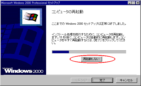 インストールファイルのコピーが完了するとコンピュータの再起動画面になるが、ここで必ず「再起動しない」ボタンをクリックして、再起動を停止してほしい。「完了」ボタンを押したり、また15秒がたつと勝手に再起動してしまうので、必ず「再起動しない」ボタンを押して再起動を阻止しないといけない。トイレなどに行かないようにと言ったのはこのためだ。
