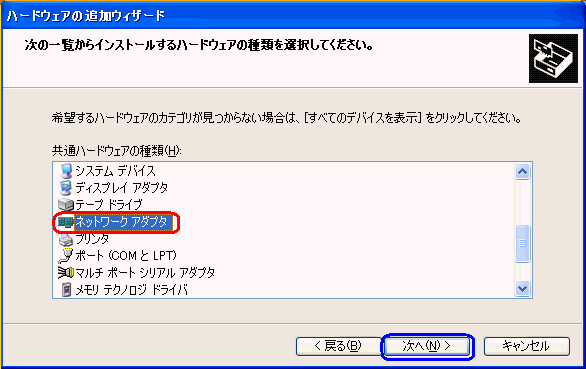 次にハードディスクの種類(カテゴリ)の選択画面になる。勿論「ネットワークアダプタ」を選択する。