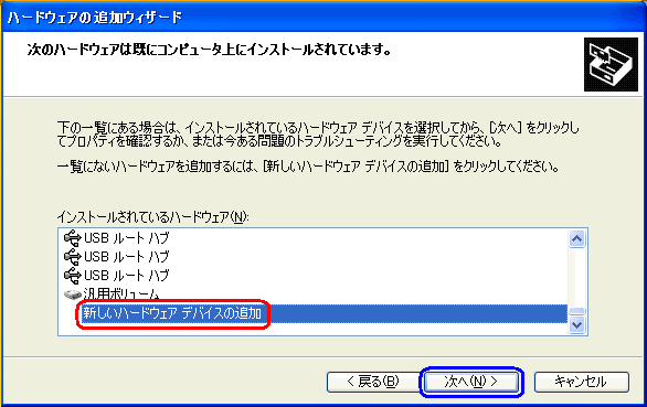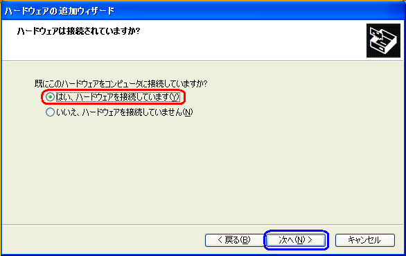 ここでは「はい、ハードウェアを接続しています(Y)」を選択する。実際にハードウェアを接続していないからといって、「いいえ。。。」の方を選択してはいけない。そうすると、ウィザードがここで終わってしまうのだ。ここは必ず「はい。。。」の方を選択して次へ進むこと。