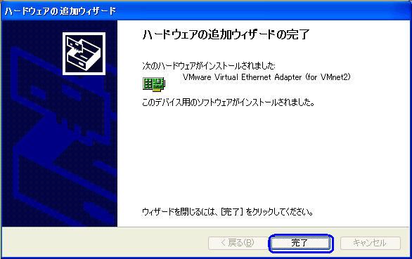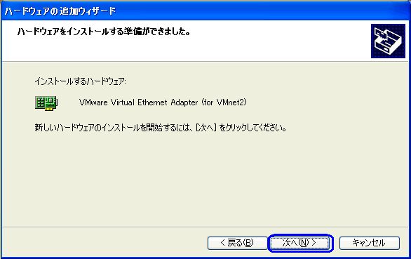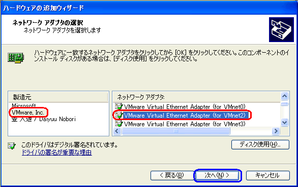 ネットワークアダプタの選択では、左の「製造元」リストから「VMware, Inc」を選択し、その選択によって表示される右の「ネットワークアダプタ」リストから、今回追加する仮想ネットワーク「VMware Virtual Ethernet Adapter (for VMnet2)」を選択して進む。