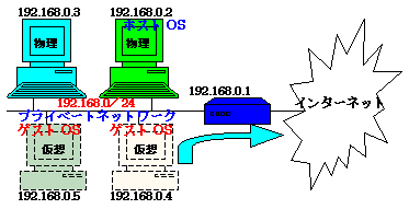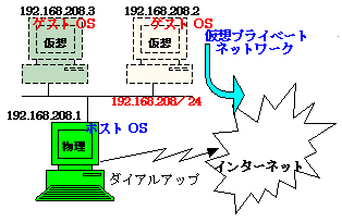 その他、Windows2000などの「インターネット接続共有」を利用してもホストオンリー構成のまま、ゲストOSからインターネットにアクセスすることができる。
