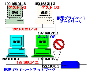 この例ではホストOSの中に閉じた「仮想プライベートネットワーク」(192.168.211.0/24)が存在する。ホストOSとゲストOS間、およびホストオンリー設定にしたゲストOS同士でのみ通信が可能だ。インターネットはおろか、物理LAN上の他のPCへの通信もできない(例外がある(後述))。
