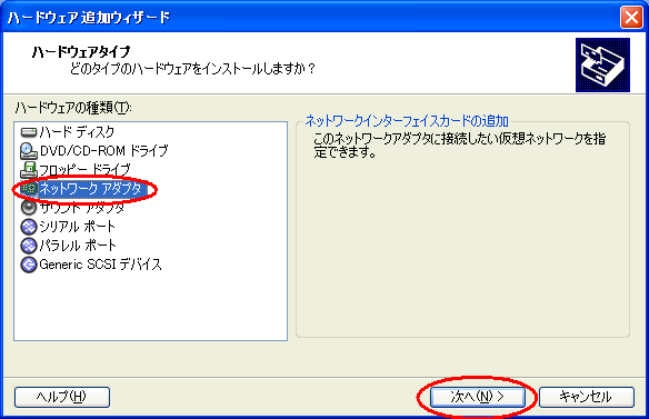 するとハードウェア追加ウィザードが始まるから、「ハードウェアの種類」リストから「ネットワーク アダプタ」を選択して、「次へ(N) >」ボタンをクリックする。