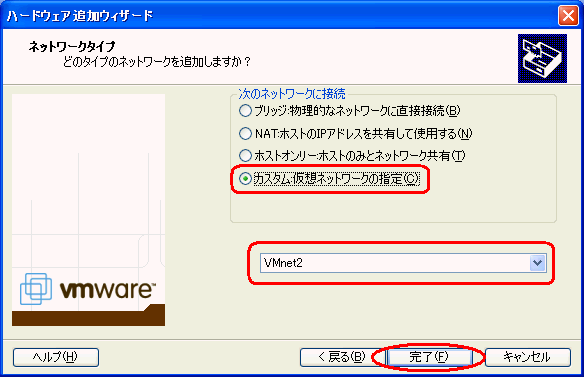 次に「ネットワークタイプ」は「カスタム:仮想ネットワークの指定(C)」を選択し、コンボボックスから「VMnet2」を選んで「完了」。