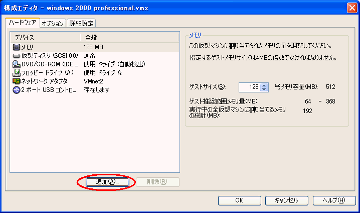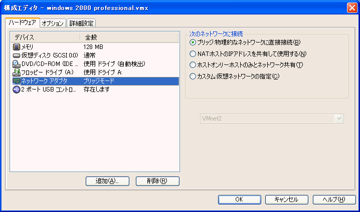 まず順に仮想マシン1から設定してみる。まずはデフォルトのネットワークカードの設定は「ブリッジ構成(VMnet0)」を選ぶ。次にこの仮想マシン1にもう一枚ネットワークカードを挿す。それは次のように行う。「構成エディタ」を起動し、「ハードウェア」タブから「追加(A)..」ボタンをクリックする。