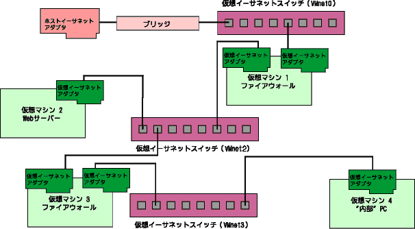 仮想マシン1は外部ネットワークと内部ネットワークにまたがっていて、それぞれを隔てるファイアウォールとなっている。仮想マシン2は外部ネットワークとひとつのファイアウォールだけで隔てられている内部ネットワーク、いわゆるDMZ(DeMiliterized Zone、非武装地帯)内に存在している。Webサーバは普通、DMZに置かれるよね。仮想マシン3はこのDMZとさらに奥の内部ネットワークに跨っていて、やはりこれらを隔てるファイアウォールとなっている。仮想マシン4は2段のファイアウォールで守られた、安全で完全な内部ネットワークにいる。最も基本的で一般的な企業ネットワークと言えるだろう。