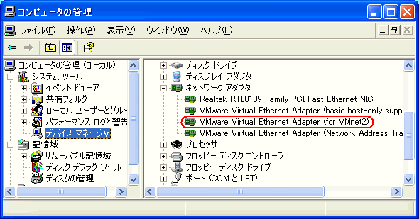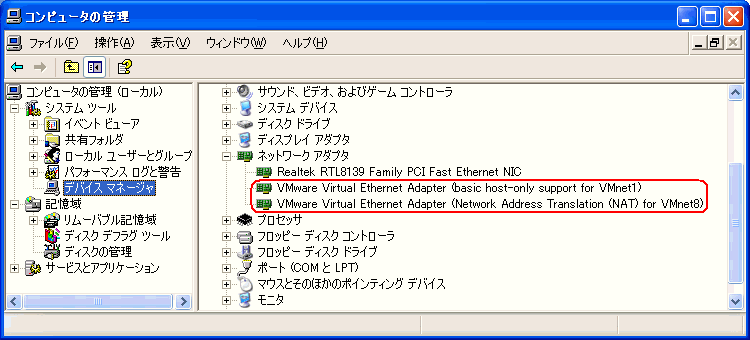 今回のホストオンリー構成用の「VMware Virtual Ethernet Adapter (basic host-only support for VMnet1)」と後述するNAT構成用の「VMware Virtual Ethernet Adapter (Network Address Translation (NAT) for VMnet8)」という2つの仮想Ethernetアダプタ(デバイス)がインストールされているのが見える。