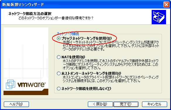 まずブリッジ構成だが、これはネットワーク構成のデフォルトにもなっている最もオーソドックスで理解もし易いものだ。多くの方は既に家庭でもEthrenetのLANを組んでおられるだろう。また今はどこのオフィスもEthernet-LANがあるはずである。ブリッジはその物理的なEthrenetのLAN上に仮想PCを置くイメージになる。仮想PCをこの設定にする場合、以下のように新規仮想マシンウィザードの「ネットワーク接続方法の選択」で「ブリッジネットワーキングを使用」を選択する。(デフォルトがこれになっている)
