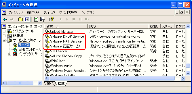 「VMware 認証サービス」というサービスは何だかよく分からないのだが、VMwareの仮想DHCPサーバ機能(後でもいろいろな場面で登場する)を一手に司る「VMware DHCP Service」と、後述するNAT機能を司る「VMware NAT Service」がある。