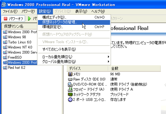 メイン画面の「設定(S)」プルダウンメニュー -> 「仮想ネットワークの管理...」をクリックする。