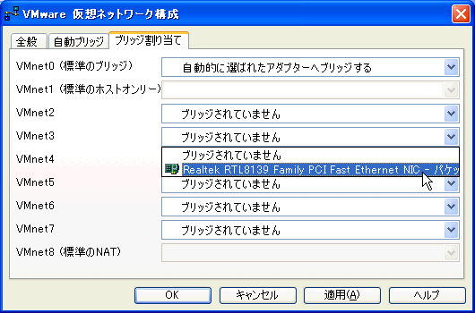 「ブリッジ割り当て」タブで各仮想ネットワークに実イーサネットアダプタを割り当てる。設定はたったこれだけである。これだけで企業内ネットワークを外部アタックから守るばりばりのファイルウォールが作れるのだからすごい!