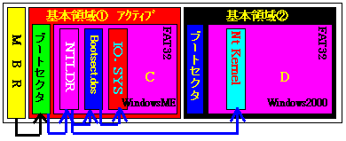 単純に考えれば、NTLDRやNTDETECT.COMなど、Windows2000のブート系ファイルを基本領域2に持っていって、Windows2000を起動するようにし、基本領域1はsysコマンドでブートセクターをDOS-IPLに戻し、直接IO.SYSを読みにいくようにして、WindowsMEを起動するようにしてしまえばいいように思える。