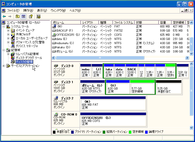 パーティションによって色分けされているのが見えるだろう。基本領域(プライマリパーティション)は「紺」、拡張領域(拡張パーティション)は「緑」、論理領域(論理ドライブ)は「青」、拡張領域中の空き領域(まだ論理領域をつくっていない領域)は「黄緑」、パーティションが一切割り当てられていない未割り当て領域が「黒」となっている。