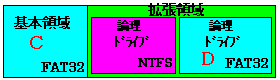 前にも説明したようにWindows9xのFDISKではNTFSパーティションは作成できないので、Windows9xだけを使っている場合にこのような構成になることはないと思いますが、NT系OSとのマルチブートの場合このような構成になるのは全く普通なことでしょう。上記のドライブレターはWindows9xやWindows9xのFDISKからみえるものです。