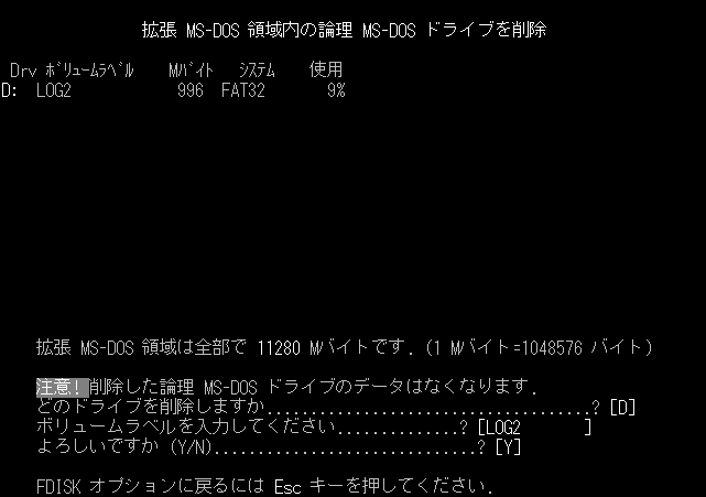 実はFDISKでこの第2論理ドライブたるDドライブを削除すると、何と第1論理ドライブであるNTFS領域を削除してしまいます。FDISKのバグだとは思うのですが、Microsoftは既知の問題であるにも関わらず、直す気が無いようです。