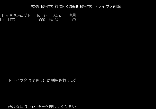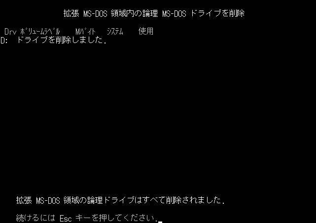 この後このドライブはいくら削除しても消えません。一旦FDISKを終了してもう一度起動してこの領域を削除するとこの領域も本当に消えます。しかし意図しなかった2つの領域の削除が行われてしまう訳です。
