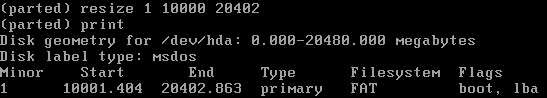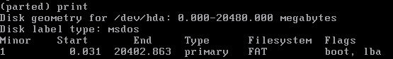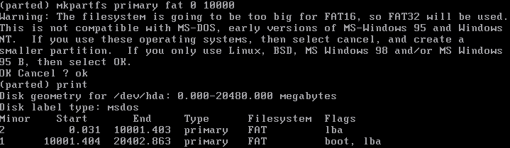 作成するサイズの関係でFAT16ではなくて、FAT32を作るかどうかの問いがあるが、これに対し「ok」とタイプして実行する。結果新しい基本領域がハードディスク先頭に完成している。位置は「10000」とアバウトに指定しても、よきに計らって最適な値「1001.403」になっていることも分かる。