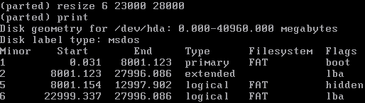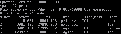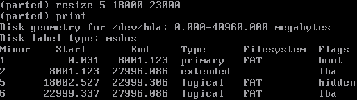 ハードディスクの先頭8GBから始まる10GBの拡張領域で、中にFAT32の5GBの論理領域が2つある。ひとつは隠し領域だが、そのことはこの作業には全然関係ない。この拡張領域を後ろに10GBずらしてみる。場面によっては「move」コマンドでもいい場合もあるが、柔軟な「resize」コマンドですべて行う。