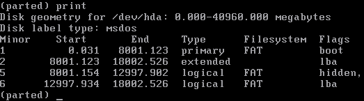 まずは現在のパーティションを表示するコマンド、「print」コマンドを実行してみよう。