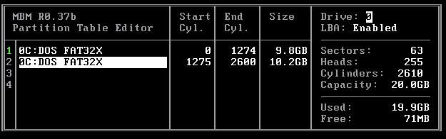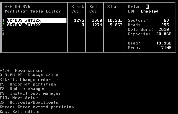 しかしパーティションテーブルのエントリを入れ替えるコマンドはPartedにはない。どうしても入れ替えたい場合は、MBMの区画エディタを使おう。MBMをインストールするか、MBMブートディスクで起動して、区画エディタを開く。