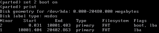 「set」コマンドを使って、当該パーティションに対し、「boot」フラグを「on」にする。