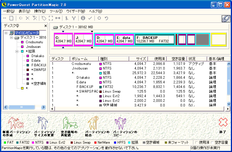 ドライブレターのふられ方も結構奥が深いので、詳細は「ドライブレターの詳細」に譲るが、基本的には最初のドライブにだけアクティブな基本領域を作り、他は全て拡張領域にするということでいいと思う。