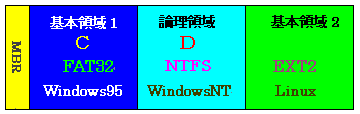 因みにWindows98/95/3.1、MS-DOSでパーティションの作成をする「FDISK」というコマンドは、基本領域は一つしか作れないという制限がある。既に基本領域があると、もう一つ基本領域を作ることができない。だから、複数の領域を作りたい場合は必ず拡張領域が必要になる。