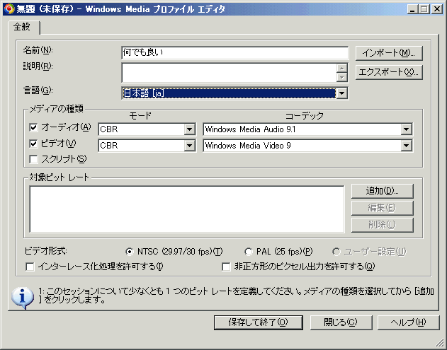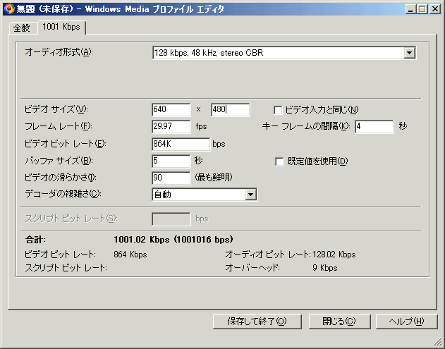 【その他設定の注意点】 ・WMV9では、「Windows Media Video 9」や「WMV9 Screen」や「WMV9 Advanced Profile」や「WMV9 Image v2」等のコーデックがあるようですが、「Windows Media Video 9」でのエンコを薦めます。Screen等でエンコすると絵が変です。
