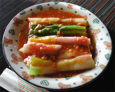 During my stay, his wife made me a "nuta" out of aka-negi in a very swift manner, and I got to eat it in a warm pit-type kotatsu, or a traditional type of heater where a table is placed over a pit with a electric heater in it. The aka-negi was boiled, then cooled with water and then served in a home made miso that was dissolved in vinegar. Aka-negi, along its stalk, has a beautiful color gradation of red, pink, white, green and yellow, with a favorable scent and little pungency in the taste.
