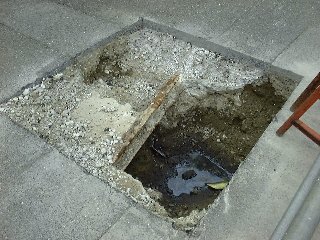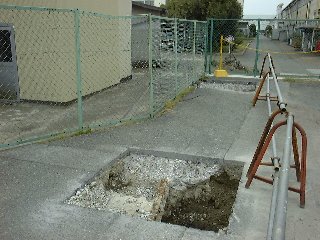 | 工事であいた地中から見える線路。 | その線路の先を見るとフェンスにも線路の型が・・。 |