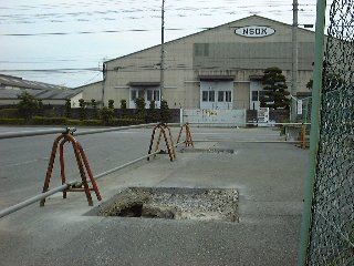 | フェンスの奥をみるとはっきりと工場内に向かって線路が続いています。 | 線路を発見した穴の反対側をみると日本触媒の工場がありました。 |