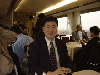 | 食堂車は発車前から行列になるという大パニック。それでも料理は問題なく出てきました。 | 私。出張帰りなのでスーツ姿です。左は西君。 |
